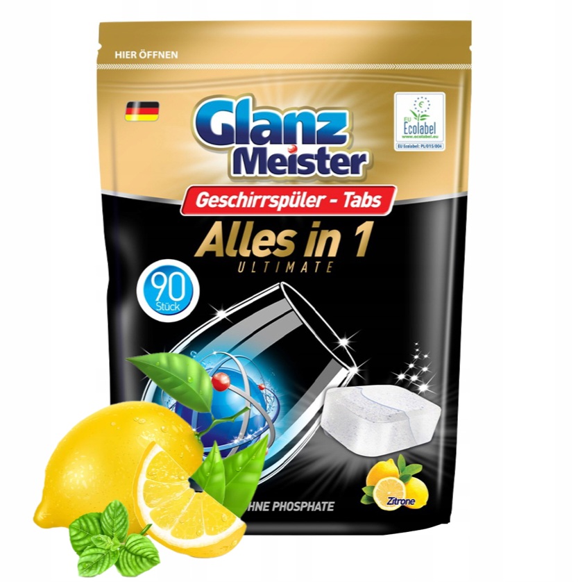 Glanzmeister Alles In 1 Ultimate Tabletki Do Zmywarki 90 szt. to wszechstronne tabletki do zmywarki "Alles in 1", które łączą w sobie funkcje detergentu, soli i nabłyszczacza, zapewniając dokładne i lśniące mycie naczyń bez konieczności używania dodatkowych środków. Dzięki zaawansowanej formule tabletki skutecznie usuwają tłuszcz, resztki jedzenia i uporczywe plamy, a przyjemny zapach cytryny pozostawia świeżość po każdym cyklu zmywania.