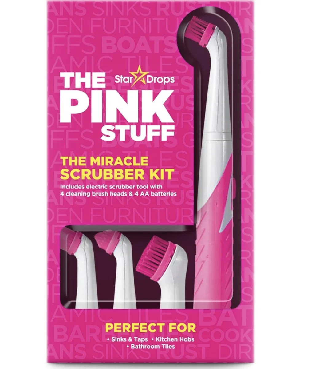 Stardrops The Pink Stuff – The Miracle Scrubber Kit to elektryczny zestaw czyszczący z 4 wymiennymi głowicami szczotek, który znacząco ułatwia sprzątanie i usuwanie uporczywych zabrudzeń w domu. Dzięki napędzanej bateriami szczotce obrotowej możesz pozbyć się brudu bez intensywnego szorowania ręcznego, co oszczędza czas i wysiłek.